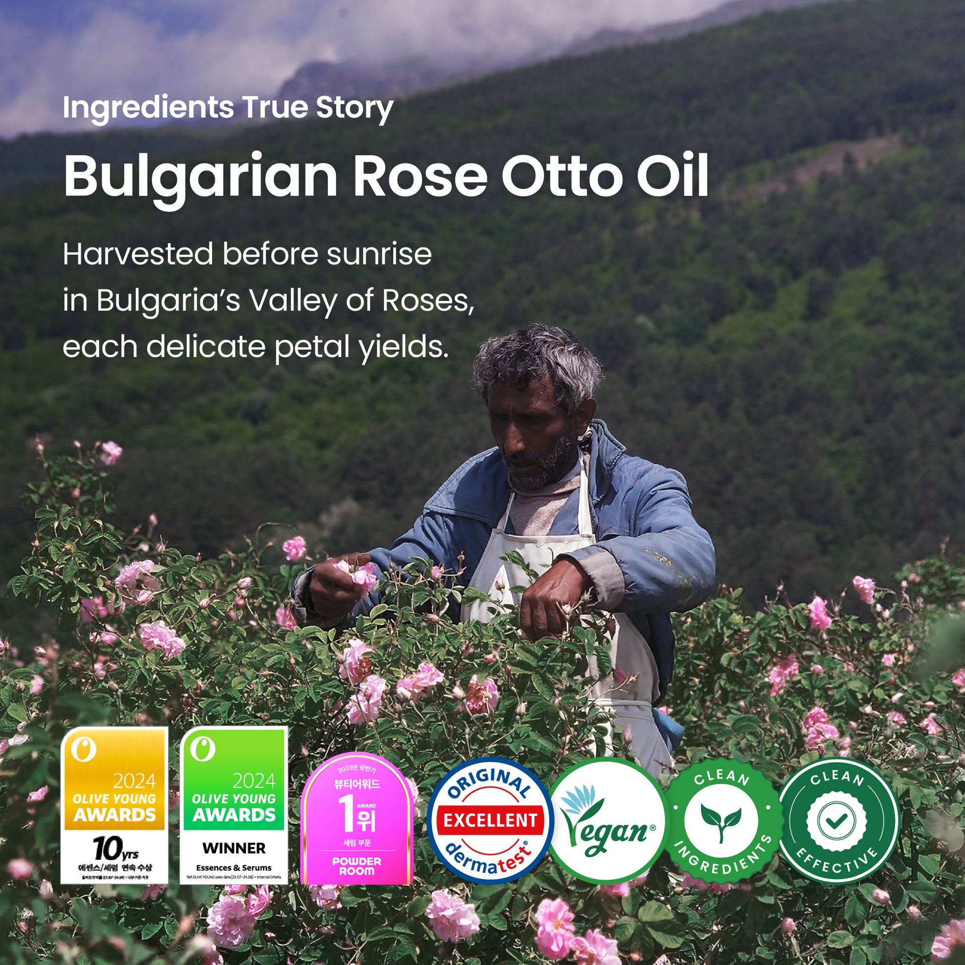 Bulgarian Rose Otto Oil is one of the rarest and most precious skincare ingredients in the world — nearly 3,000 hand-picked roses are needed to produce just 1 gram of pure oil.